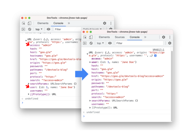 콘솔 에서 link 를 로깅해보세요. 객체의 자체 속성은 굵게 표시되고 첫번째로 노출됩니다. 이러한 변경을 통해 커스텀 속성을 더 쉽게 찾을 수 있습니다. 특히 상속되는 속성이 많은 Web APIs (예: URL)에서 유용합니다.
