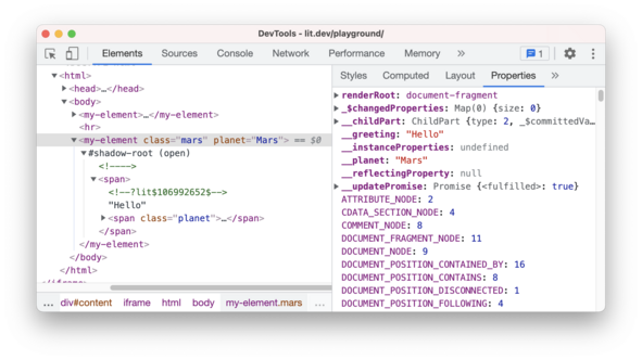 위의 변경사항 외에도, 속성 영역의 속성도 1차원화 되었습니다. 이를 통해 DOM 속성 디버깅 경험을 개선하였으며, 특히 Web components 에서 유용합니다.