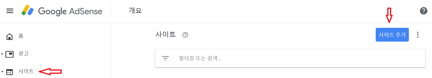 3. 왼쪽메뉴에서 사이트를 클릭 후 사이트 추가 을 클릭합니다.