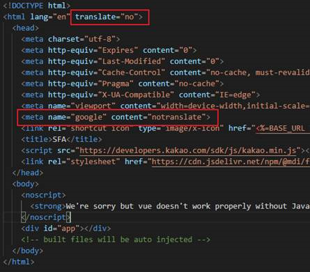 이럴 때 개인 웹사이트이거나 업무 사이트인 경우 사이트의 메인 페이지(index.html)파일에 다음과 같은 메타 태그와 html 태그에 translate 속성값을 추가하세요. meta태그는 head 태그 안에 선언합니다.
