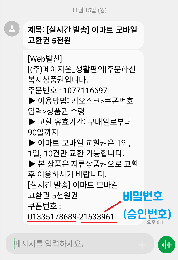 쿠폰번호 11자리 뒤에 8자리의숫자는 비밀번호(승인번호)입니다.