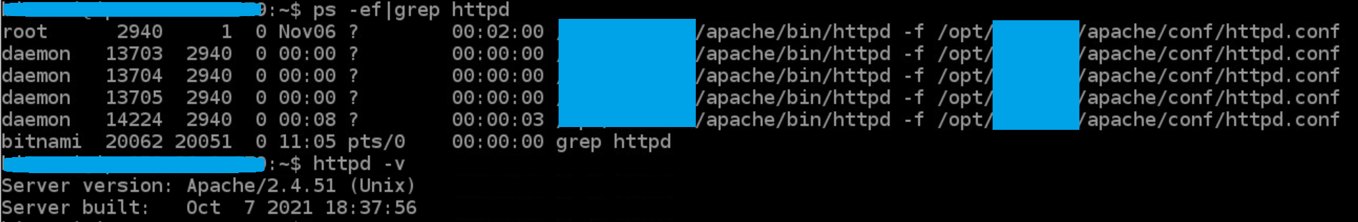서버에 접근 후 “ps -ef|grep httpd” 명령어를 실행 후 httpd -v 명령어를 실행한다.