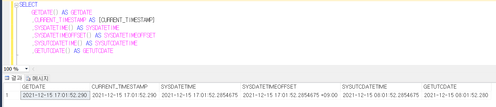 다음과 같은 결과를 얻을 수 있어요. CURRENT_TIMESTAMP 키워드의 경우 알리아스(AS)를 줄 때 동일한 이름로 별명을 지정할 수 없음으로 대괄호[ ]를 이용하여 묶어주면 동일한 이름으로 별명을 지정할 수 있어요.