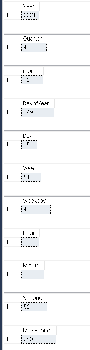 다음은 현재날짜시간 기준으로 년도,쿼터,월,년기준으로 일, 일, 주, 시간, 분, 초, 밀리초로 쪼개서 가져 쿼리입니다.