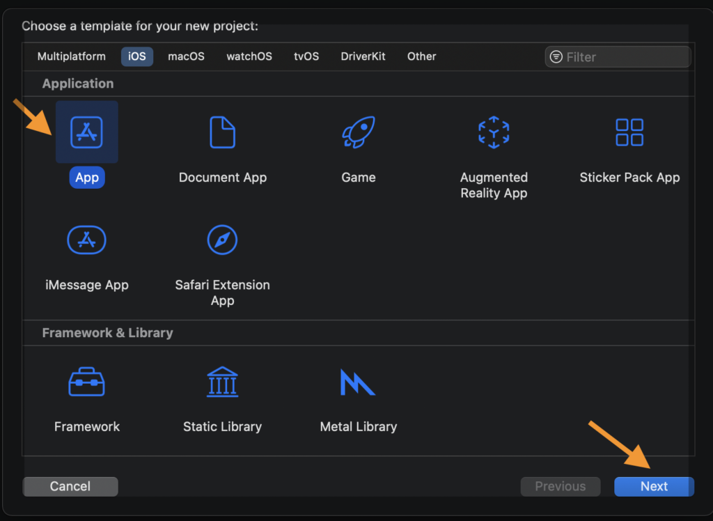 3. 템플릿을 선택하세요. iOS탭을 선택후 Application 영역에서 App를 선택한 후 Next 버튼을 클릭합니다.