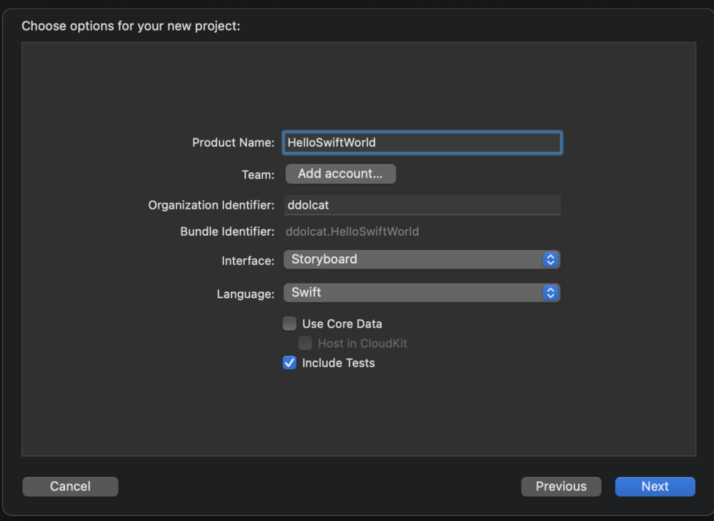 • Include Tests는 프로젝트 생성시 앱의 동작에 대한 테스트를 위해 테스트 포함 여부에 대한 선택입니다.