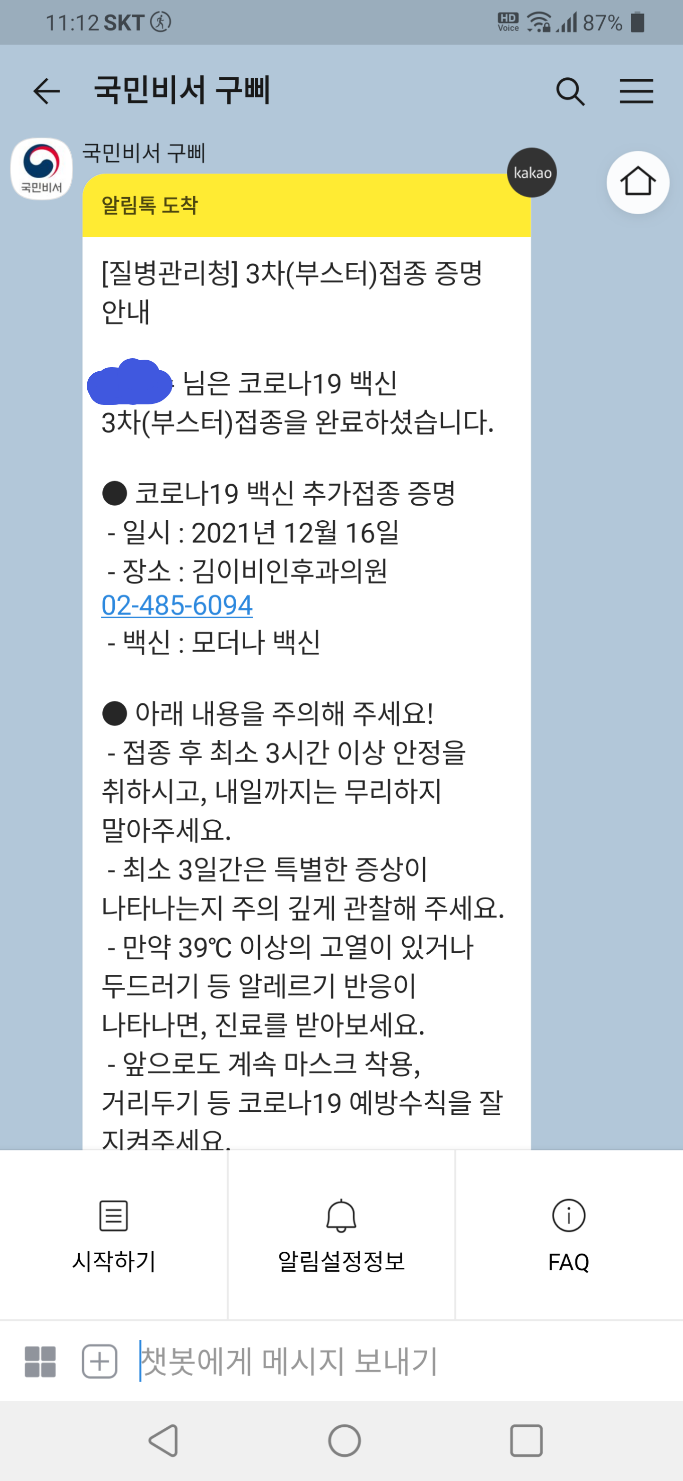 병원에서 15분 대기 후 집으로 돌아왔다. 돌아오는 길에 바로 국민비서 구삐로 부터 접종완료 카톡 알림을 받았다.