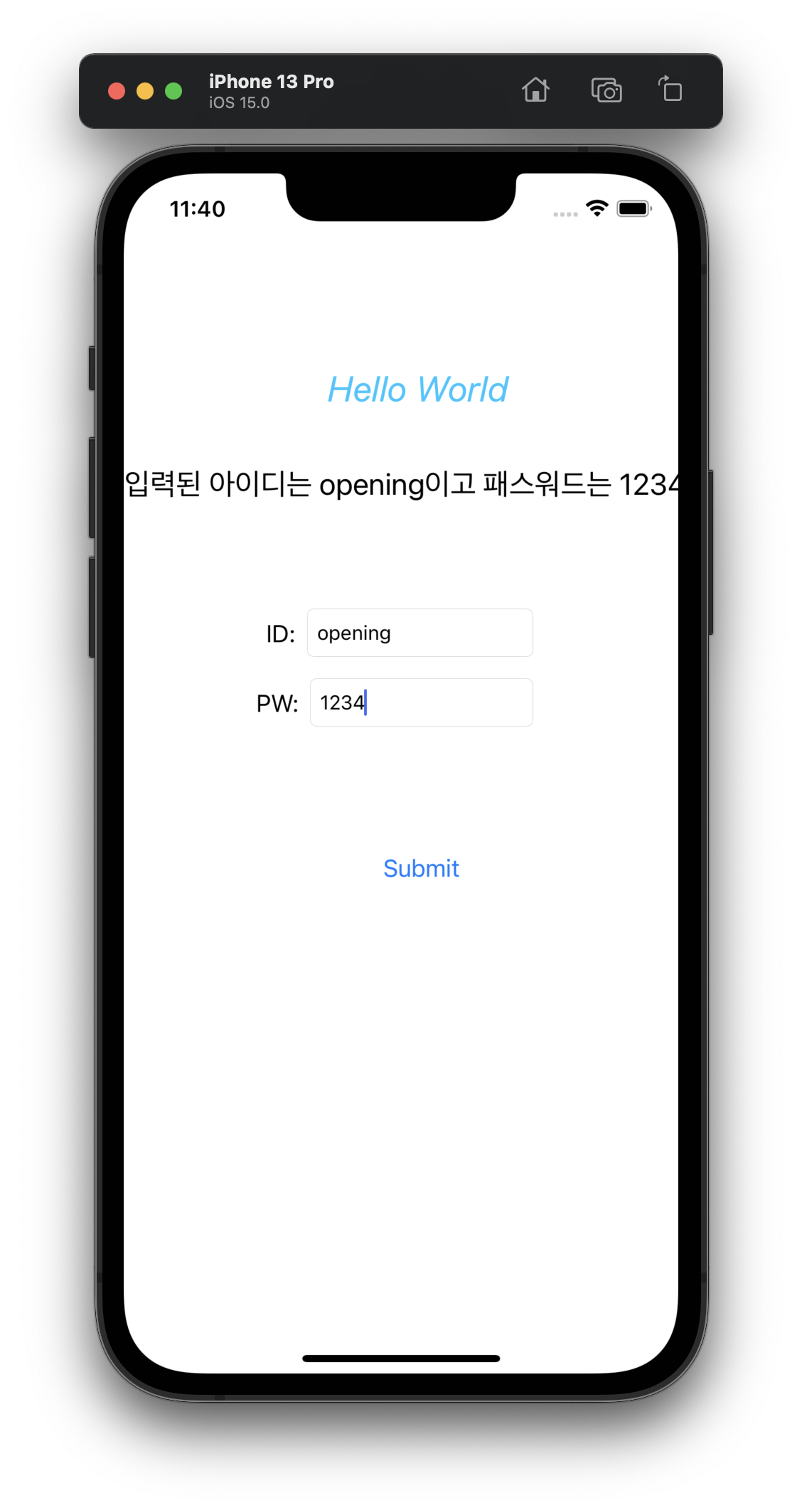 다음은 시뮬레이터 실행 후 아이디와 비빌번호를 입력후 Submit 버튼을 클릭한 결과 입니다.