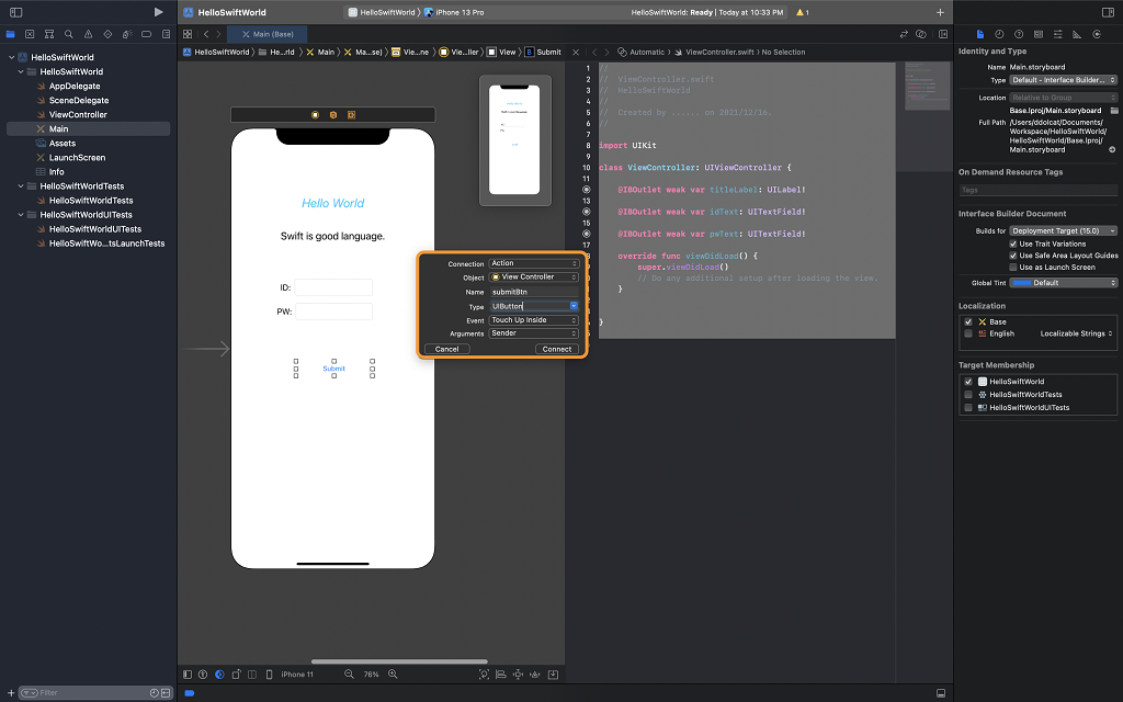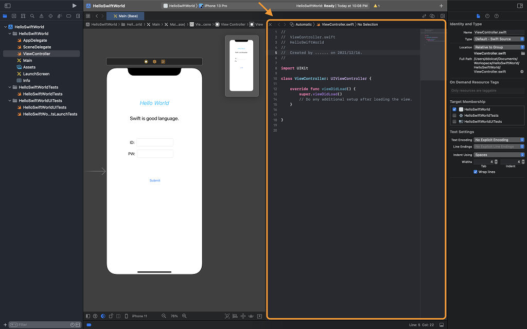 3. 왼쪽 스토리보드에서 Hellow World 레이블을 마우스 오른쪽 버튼으로 선택 후 오른쪽 코드 편집기 영역으로 드래그합니다.