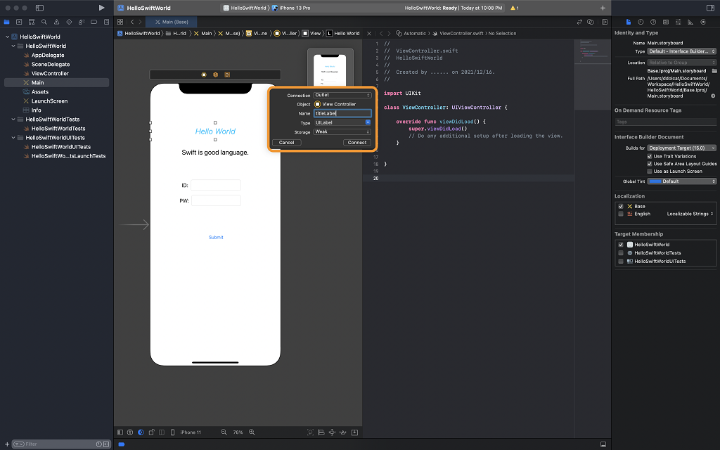 4. 아웃렛변수 입력창이 나타나는데, 변수이름을 titleLabel로 타이핑 후 Connect 버튼을 클릭하면 소스 편집기 영역에 아웃렛 변수가 추가 됩니다. 직접 코드 작성하여 변수를 추가해도 됩니다.