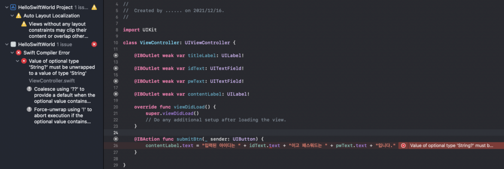 idText.text 뒤에 !(느낌표)가 없으면 다음과 같은 오류가 발생합니다. 옵셔널 타입의 변수를 랩핑 해제야한다는군요.