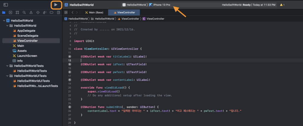 텍스트 필드와 버튼이 동작할 수 있도록 아웃렛 변수와 액션 함수를 추가해야합니다. id입력창에 접근할 변수를 생성하는 것이죠.스위프트에서는 이 변수를 아웃렛변수(Outlet Variable)라고 합니다. 다음으로 버튼을 클릭했을 때 아이디와 비번으로 입력된 값을 읽어와 레이블에 출력하는 기능의 함수를 만들어줍니다. 이 함수를 Action Function(액션함수)라고 합니다.