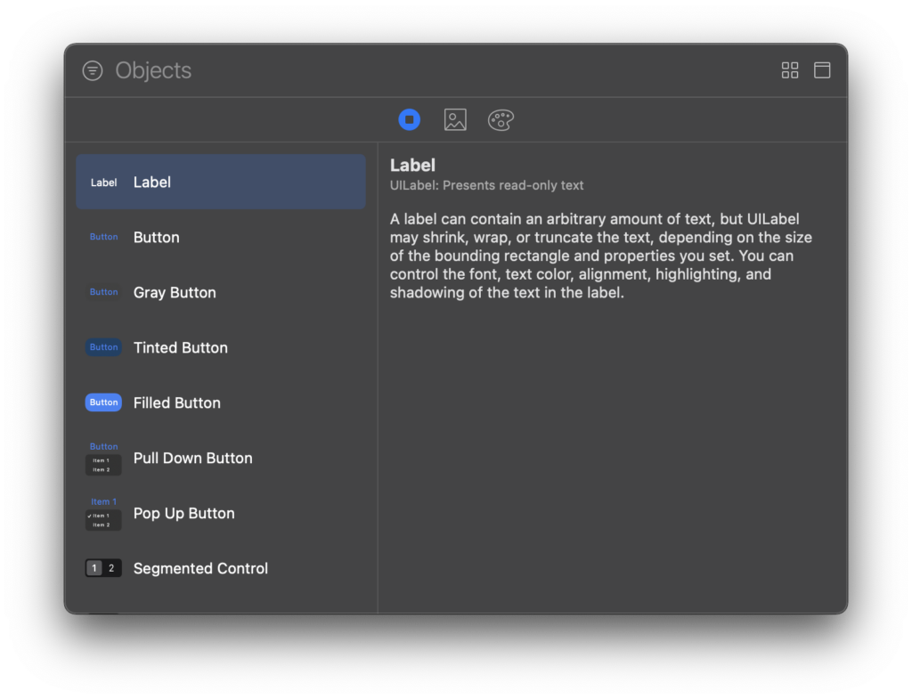 - Show Library창은 다음과 같은 객체들의 목록을 보여줍니다. 화면 UI 구성에 필요한 레이블, 버튼, 텍스트 필드 등 있습니다.