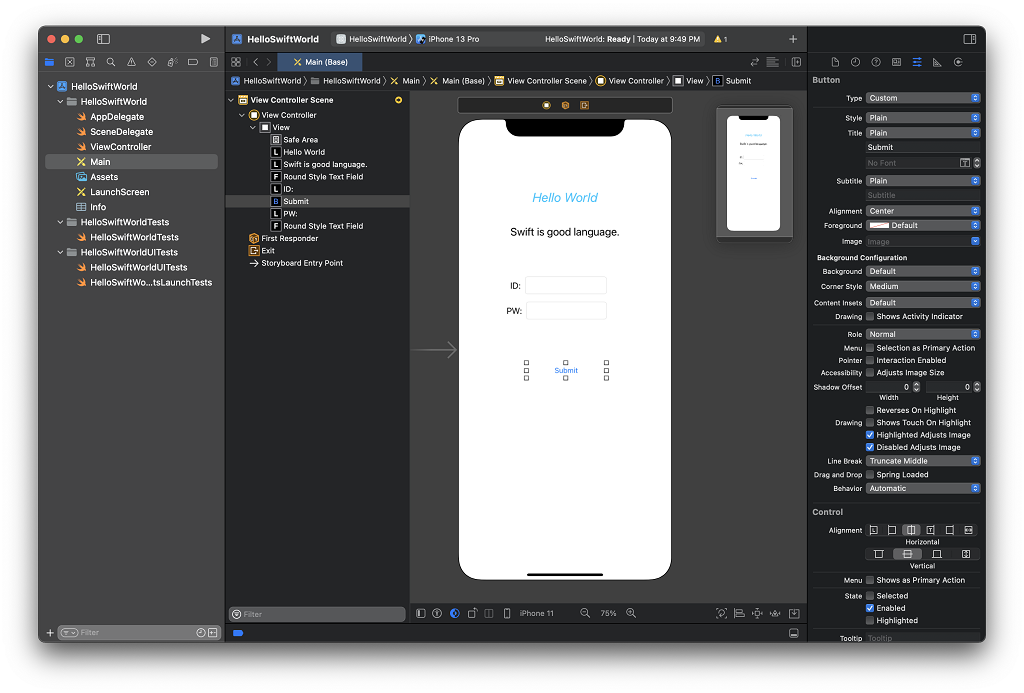 스토리보드에 Hello World를 출력하는 방법