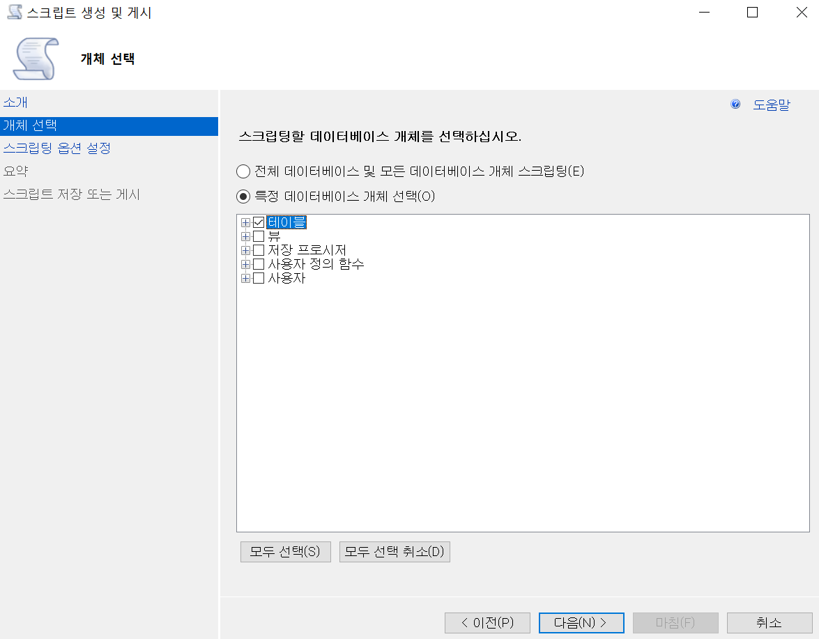 4. 스크립트 생성 및 게시 마법사 팝업에서 전체를 할지 원하는 테이블만 할지 선택