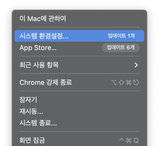 2. 시스템 환경설정… 메뉴를 클릭 ( 업데이트할 대상이 생기는 경우 업데이트 1개 처럼 개수가 표기됩니다.)