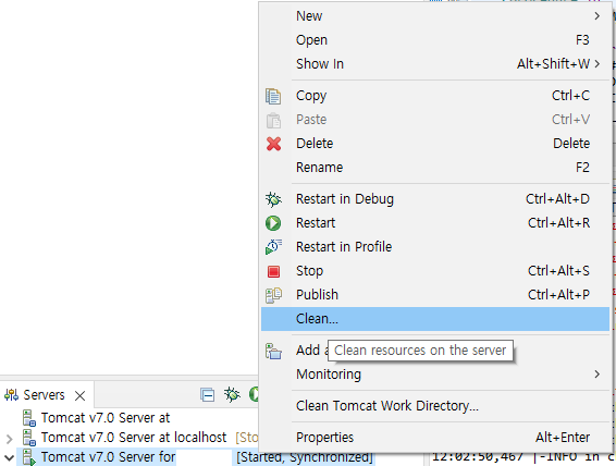 그래서 다음 작업으로 톰켓서버에서 마우스 우클릭 후 Clean.. 작업을 하였다.
