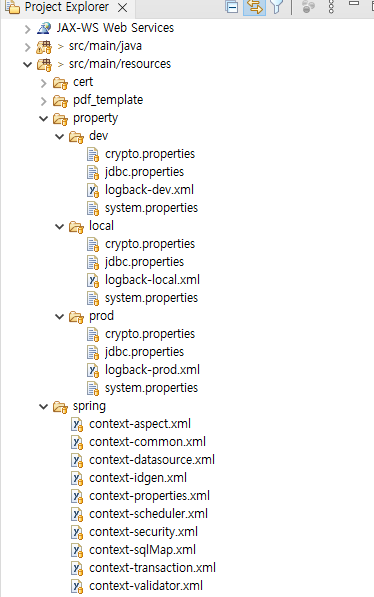 설정관련 파일들은 개발환경과 로컬환경 그리고 운영환경으로 각각 분리되어 구성되어 있다.