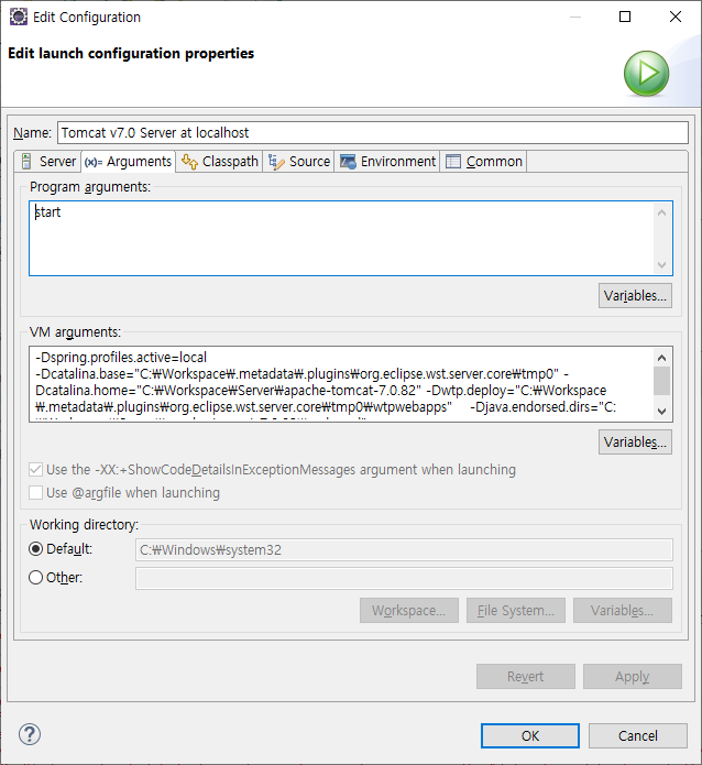Arguments 탭을 클릭 후 VM arguments: 탭에서 다음 한 줄을 추가하였다.