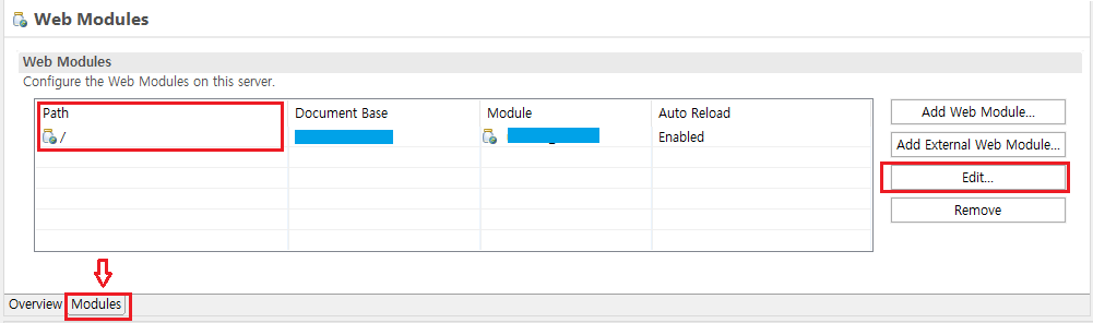 Module 탭을 클릭하여 Path 설정을 변경 후 정상적으로 로그인 되었다.