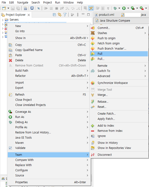 1. 프로젝트 익스플로어탭에서 프로젝트 선택