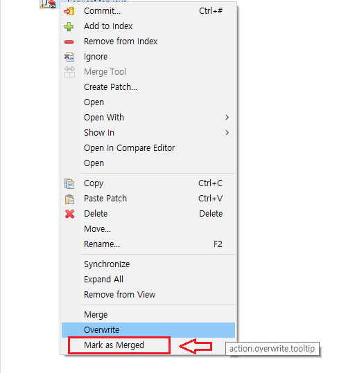 Overwrite 한 후 > Mark as Merged 를 클릭해야한다.