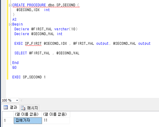 두번째 프로시저 생성 후 첫번째 프로시저를 호출하여 리턴값을 변수로 전달 받습니다.