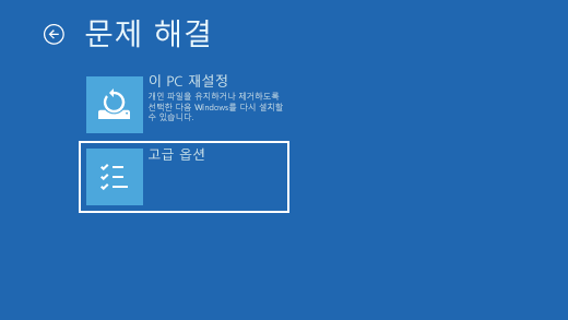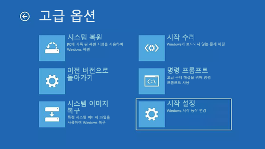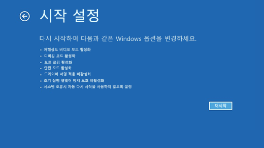 - 옵션 선택 화면에서 문제 해결 > 고급 옵션 > 시작 설정 > 다시 시작을 선택합니다.