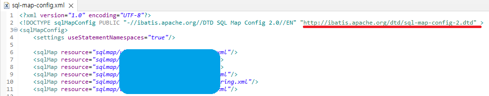 SQLMap환경설정파일 (sql-map.config.xml) 파일도 동일하게 dtd경로 설정을 변경해주세요.