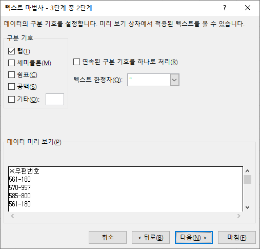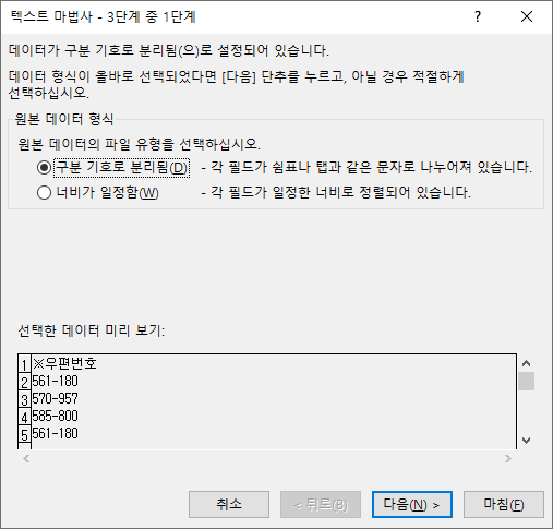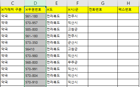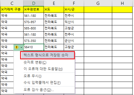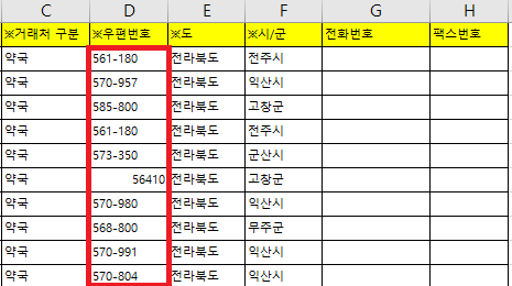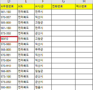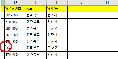D열의 우편번호를 보면 문자와 숫자가 혼합된 구조입니다