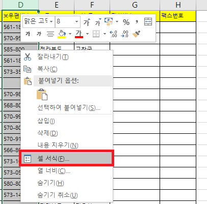 텍스트 형식으로 변경하기 위해 열을 전체 선택 후 마우스 우클릭하여 셀서식 변경으로 이동하게 됩니다.
