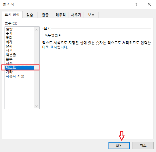 그리고 난 후 표시 형식 탭에서 텍스트를 선택 후 확인 버튼을 누르게 됩니다.