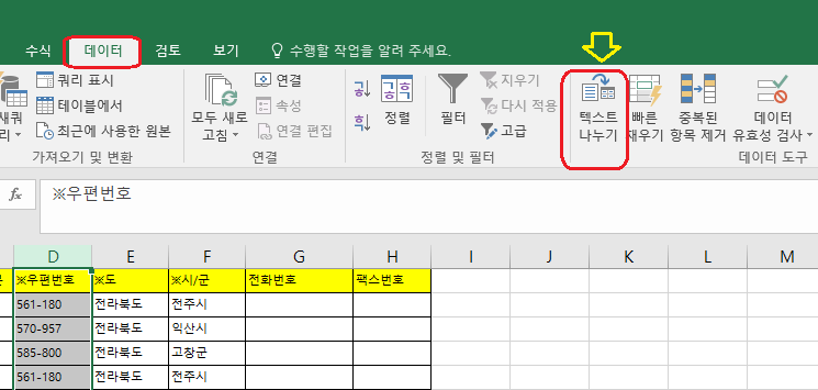 2. 상단 메뉴 중에 데이터 > 텍스트 나누기 아이콘을 클릭