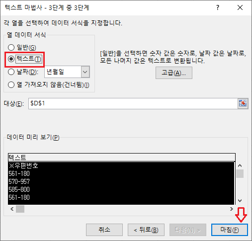 5. 열 데이터 서식에서 텍스트를 선택 후 마침 클릭