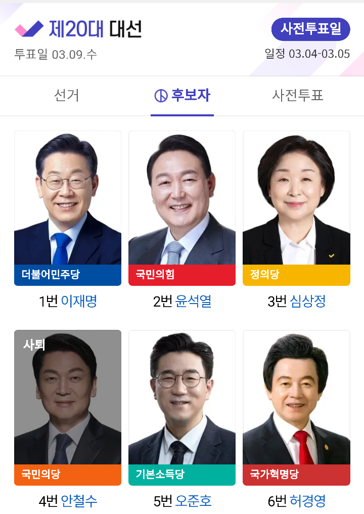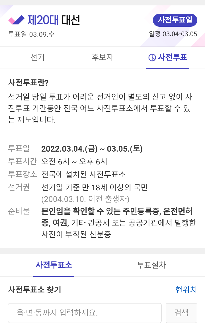 20대 대선 사전투표가 시작되었다. 오늘부터 내일 토요일까지 아침 6시부터 오후 6시까지 투표할 수 있다.
