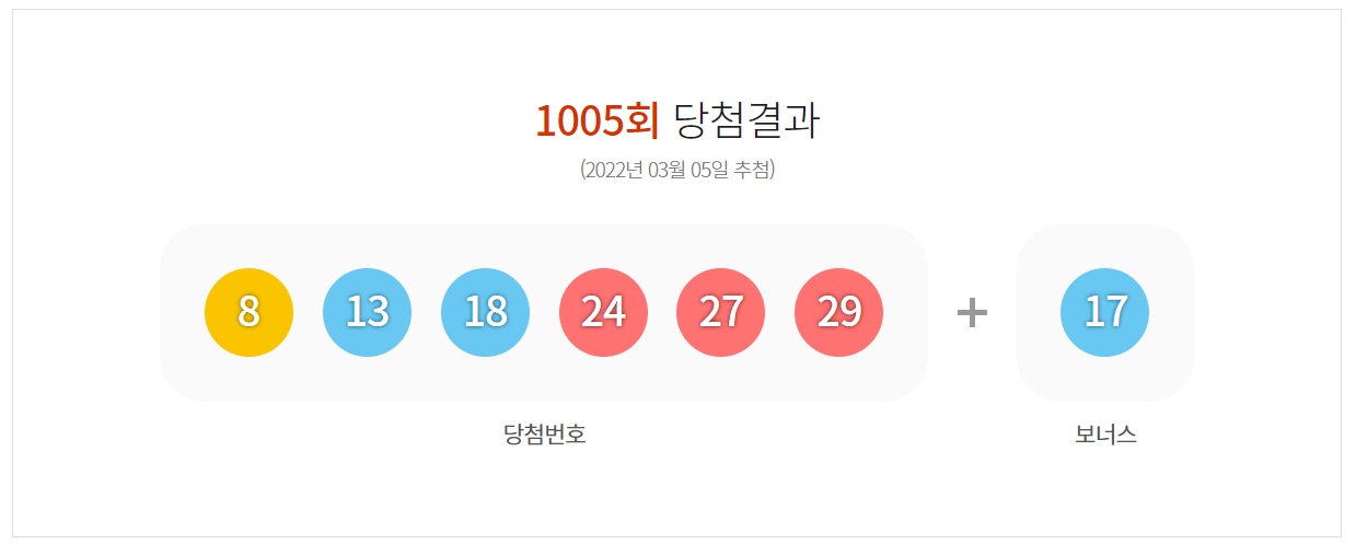 1등 로또 당첨번호는 8,13,18,24,27,29 (보너스 번호 17) 입니다