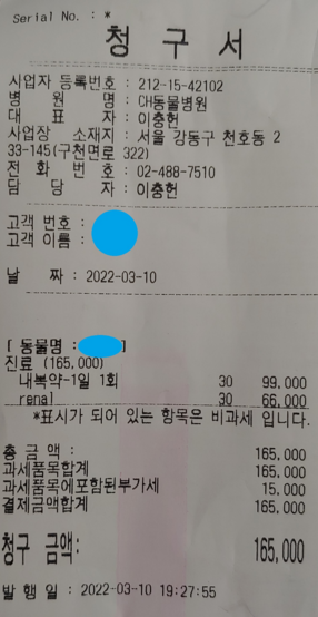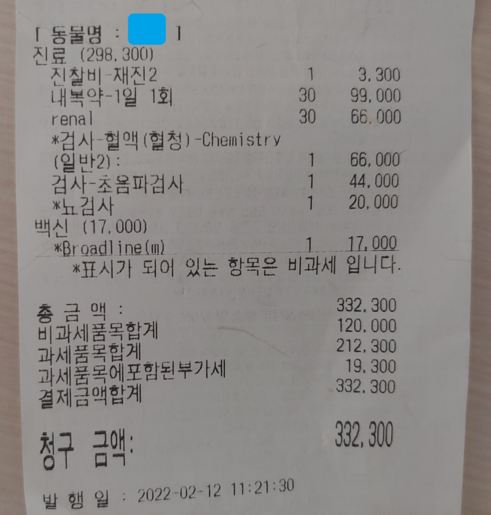 신부전 내복약 30일치 분량의 비용은 99,000원이고,