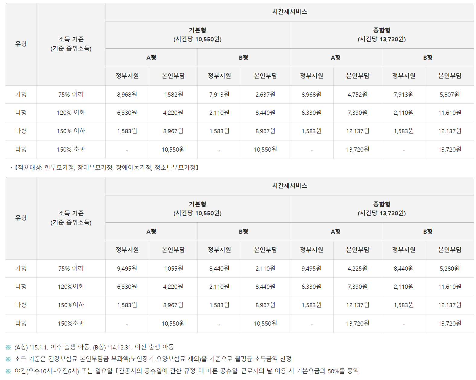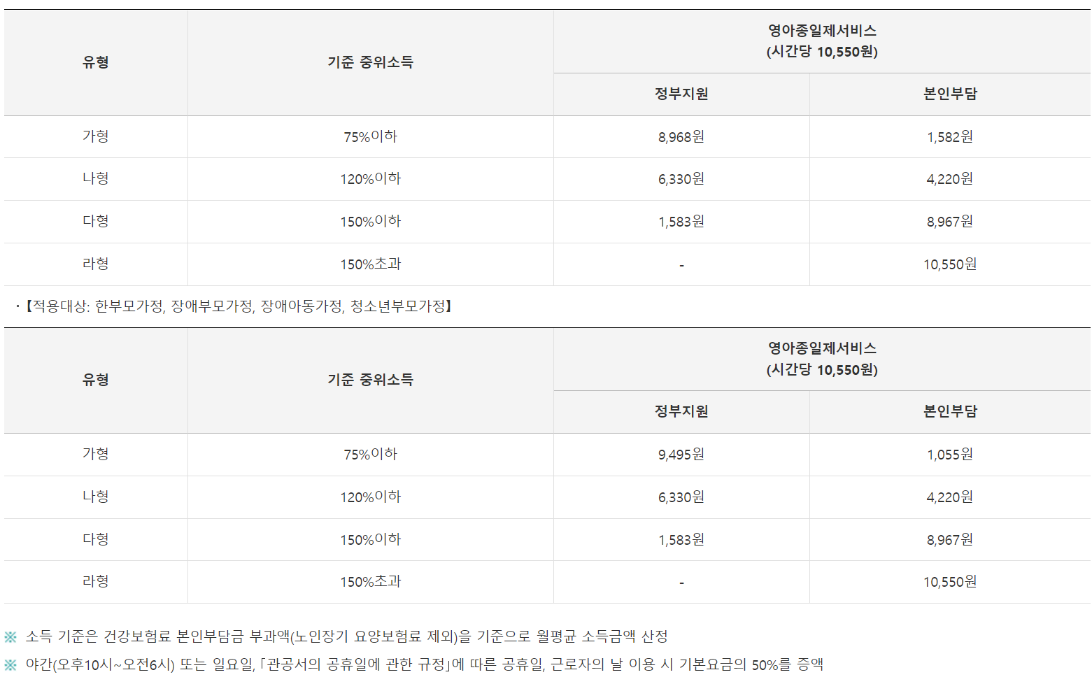 아이돌봄 서비스 지원 대상 정보(정부지원금 및 본인부담금)