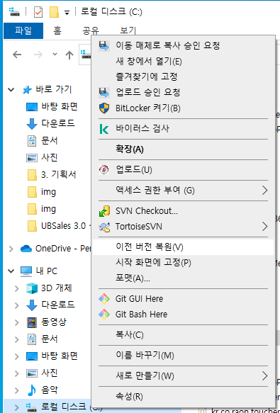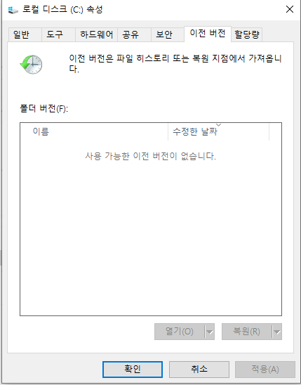 하드 디스크를 선택 후 이전 버전복원(V) 메뉴를 클릭하였다.
