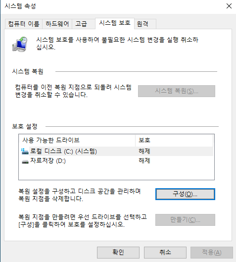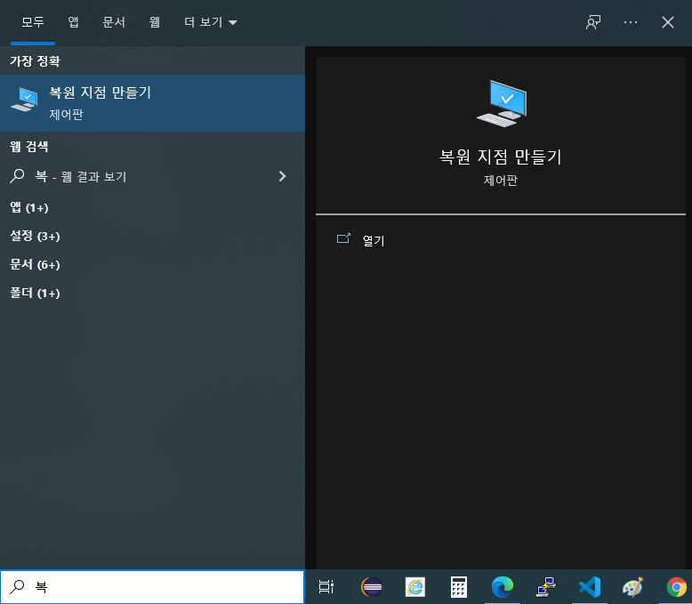 윈도우 하단의 작업표시줄에서 검색어로 복원을 검색하여 “복원지점 만들기”