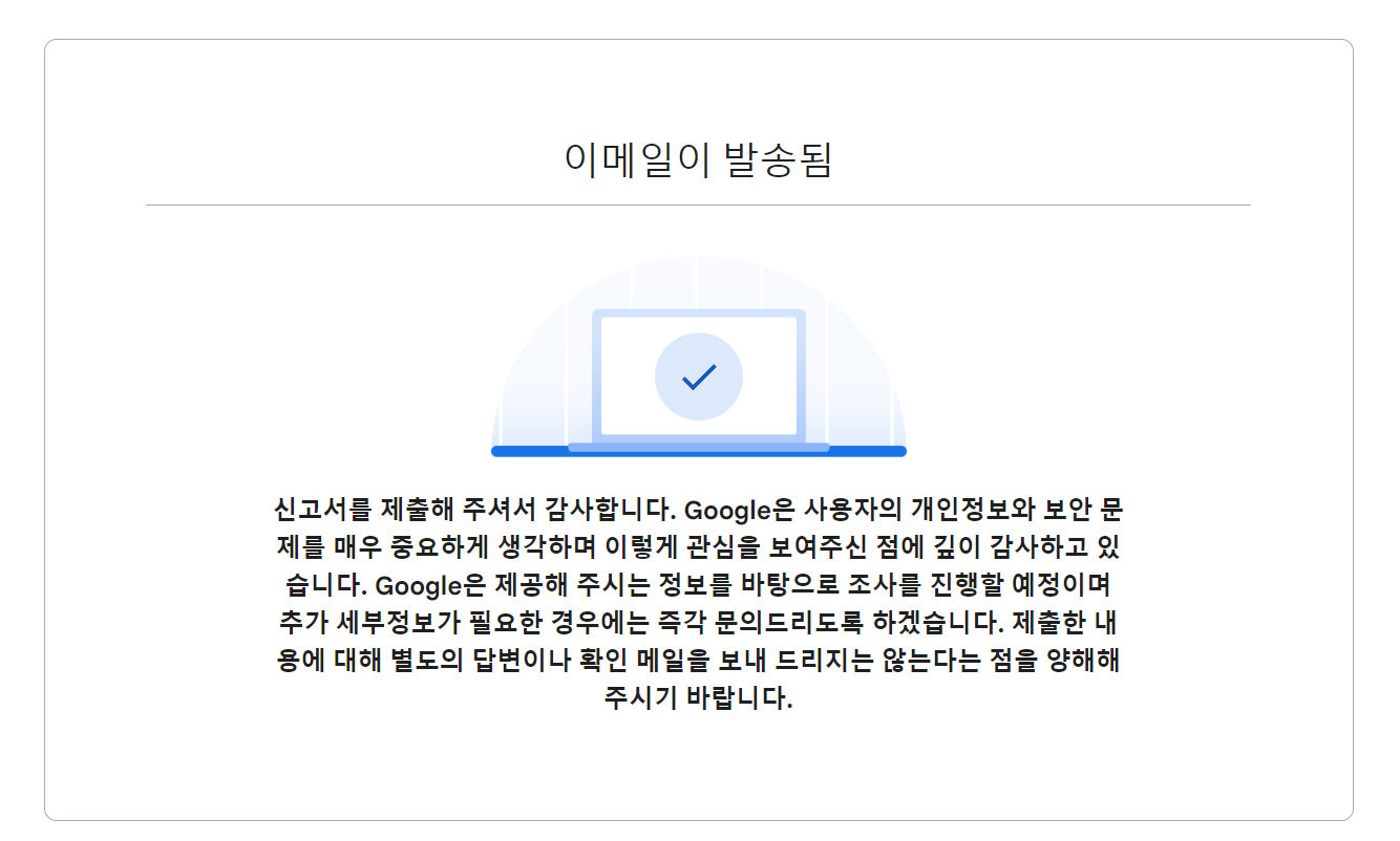 일단 의심스러운 이메일을 받았다면 아래 구글 지원 사이트에서 신고를 하자