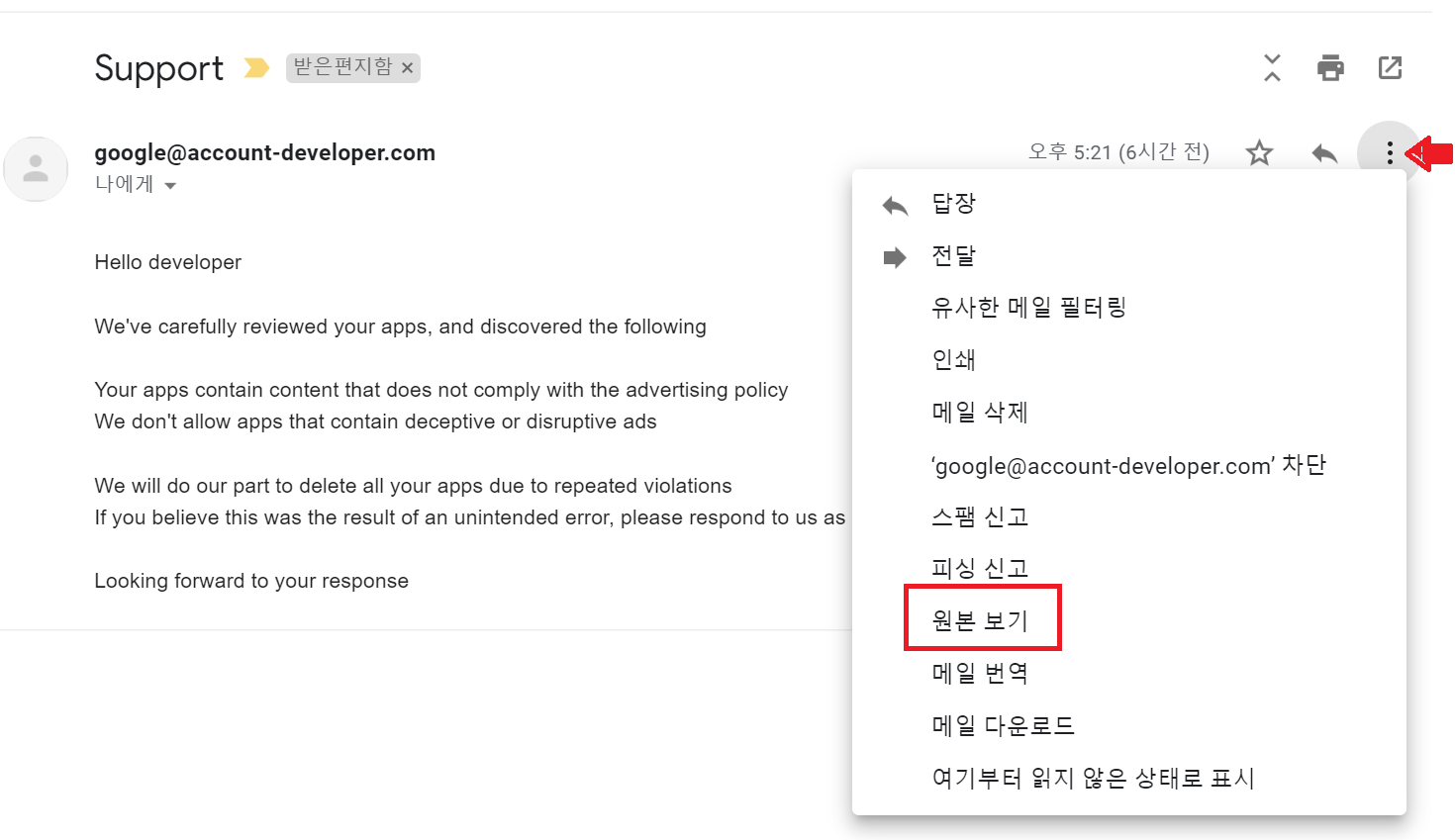 해당 메일에서 답장 버튼 옆에 목록 버튼을 누른 후 “원본 보기”를 누르면