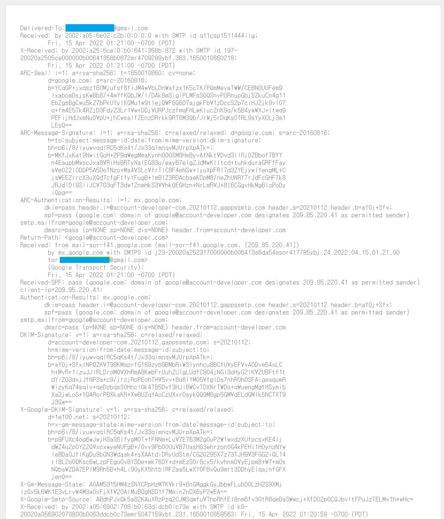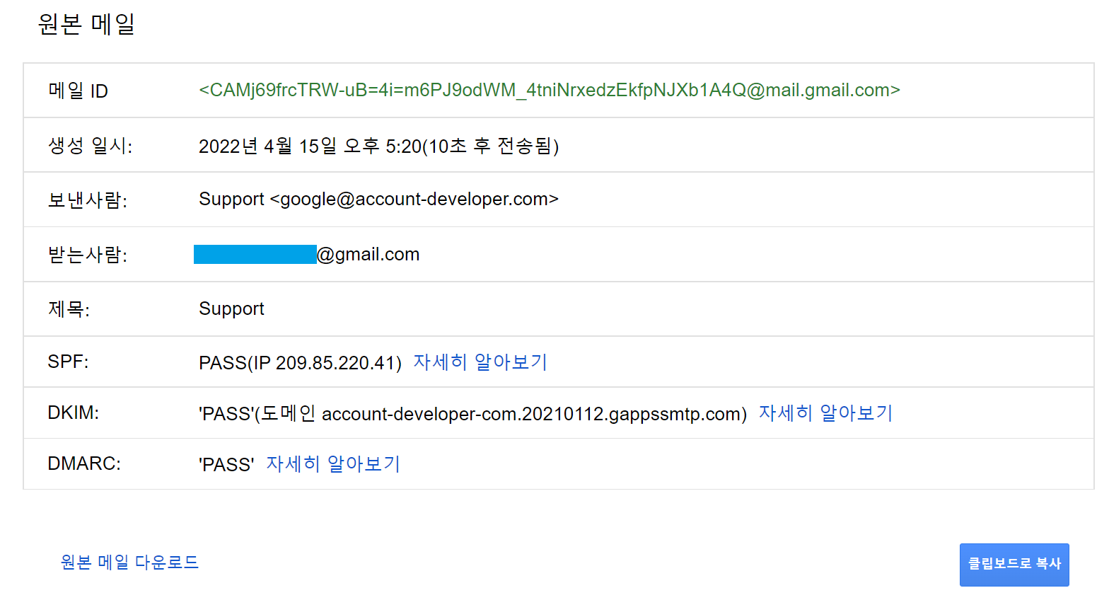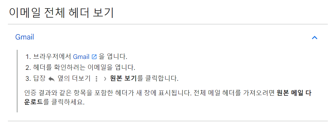 Gmail에서 받은 이메일의 경우 헤더를 보고 발신자가 보낸 이메일이 수신자의 메일 서버에 도착한 과정을 포함하여 이메일의 출처를 확인할 수 있습니다.