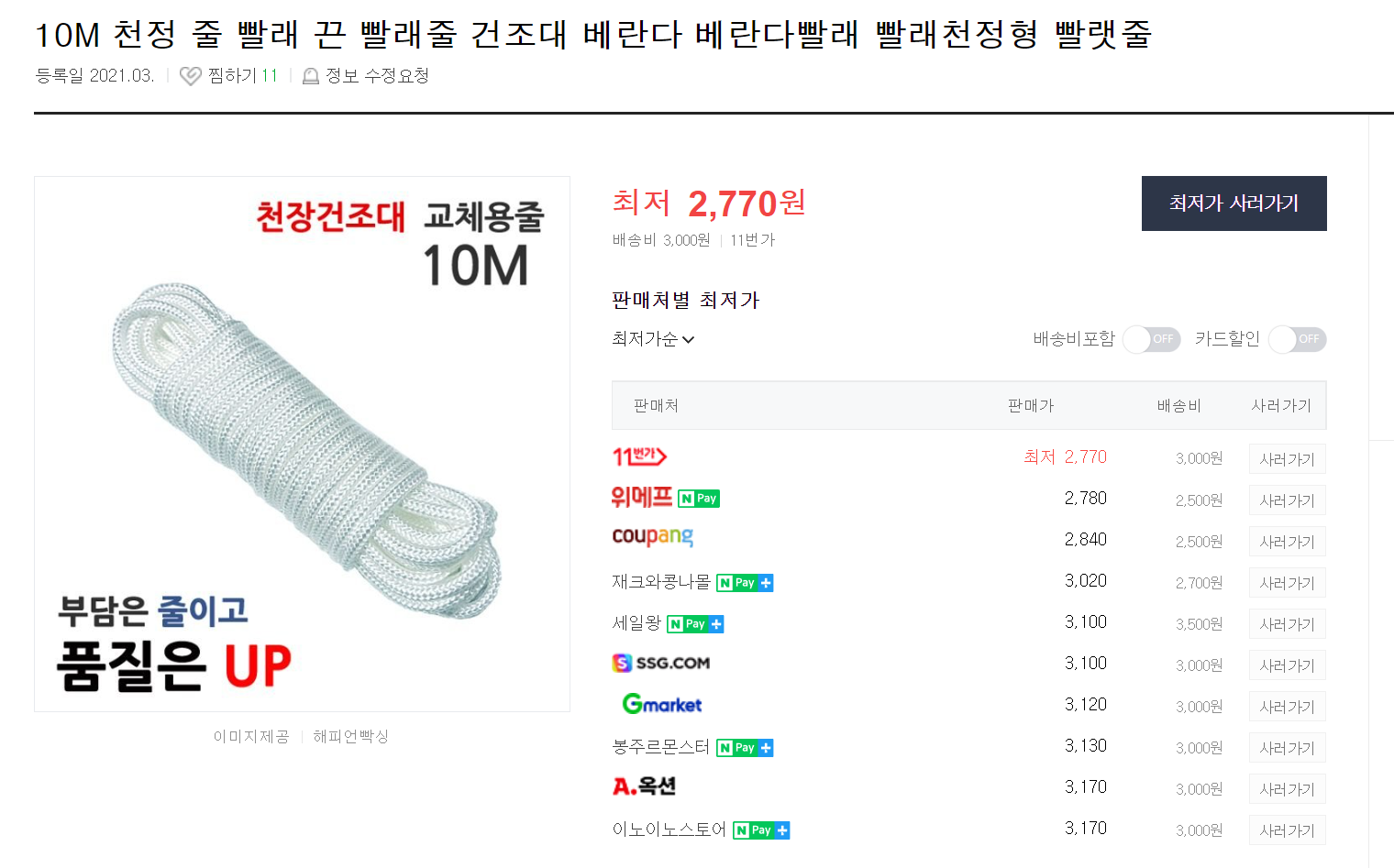 그럼으로 상단에 빨래줄 관련 스크린샷을 참고하여 온라인쇼핑몰에서