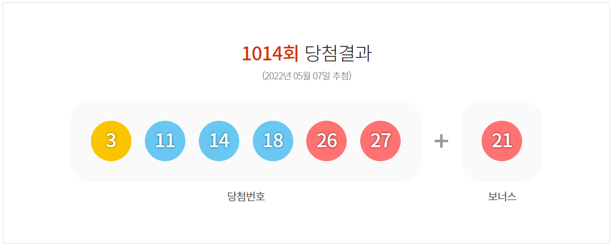 1등 로또 당첨번호는 3,11,14,18,26,27 (보너스 번호 21) 입니다