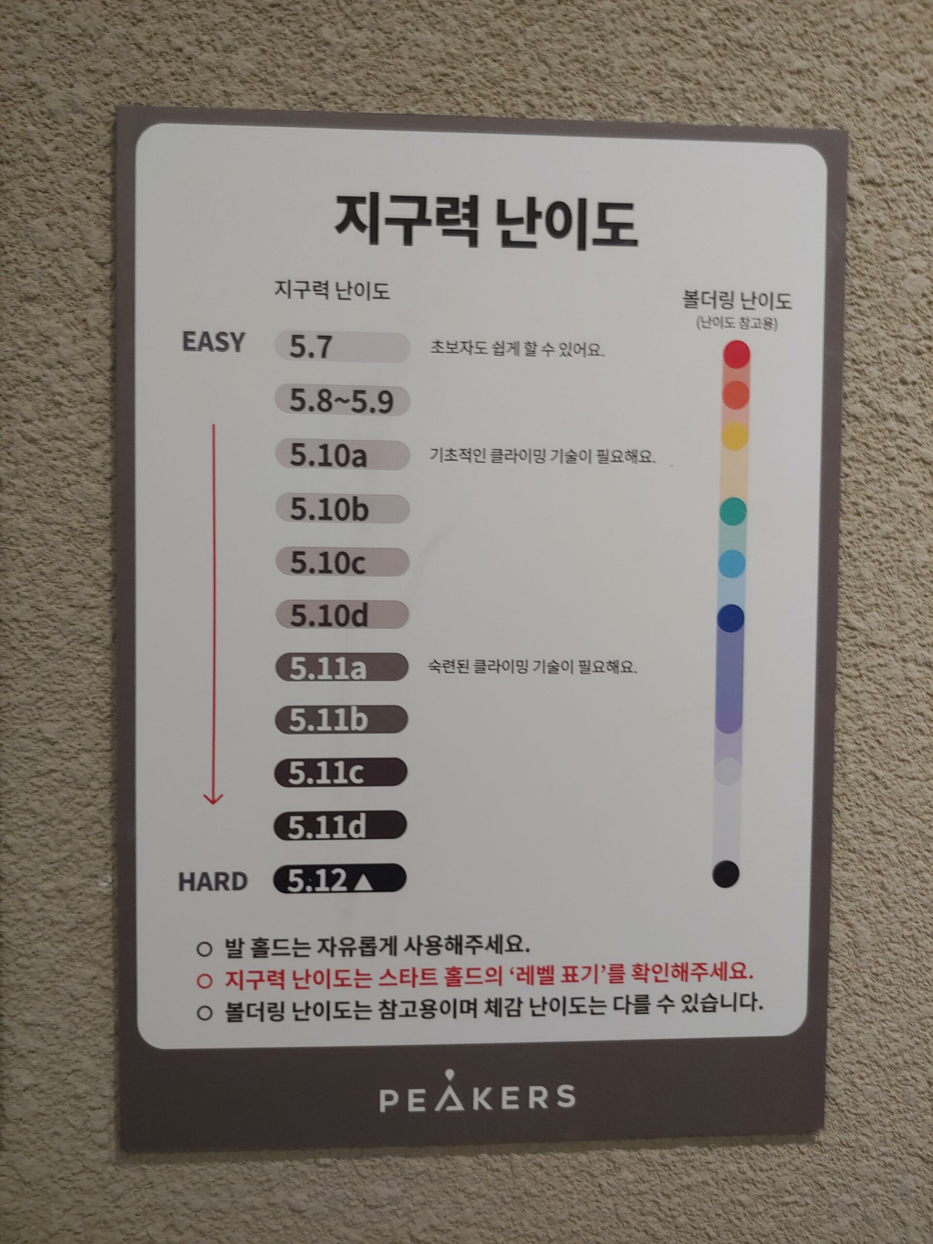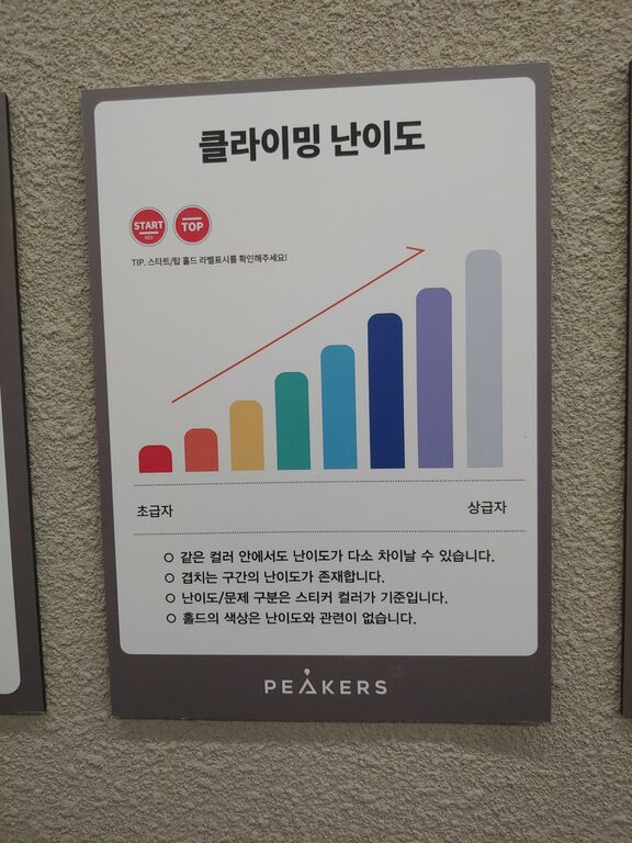 WHERE ARE YOU NOW? 나는 어느 등급에 속할까? 체험을 해보니 그린 난이도까지는 할만했다. 블루 난이도부터가 상당히 어려웠다. 블루 난이도부터는 정상(TOP)을 찍고 내려오는 것은 실패했다. 네이비 난이도나 퍼플 그레이 등은 그냥 근쳐에 가서 구경하고 시작점을 만져보고 매달려 보기만 했다. 초보자는 결코 할 수 없는 영역이다. 힘으로 되는 게 아니더라…..