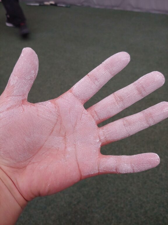 클라이밍 하기 전에는 반드시 손에 마법의 하얀 가루를 바르고 시작해야 손과 몸을 보호할 수 있다.