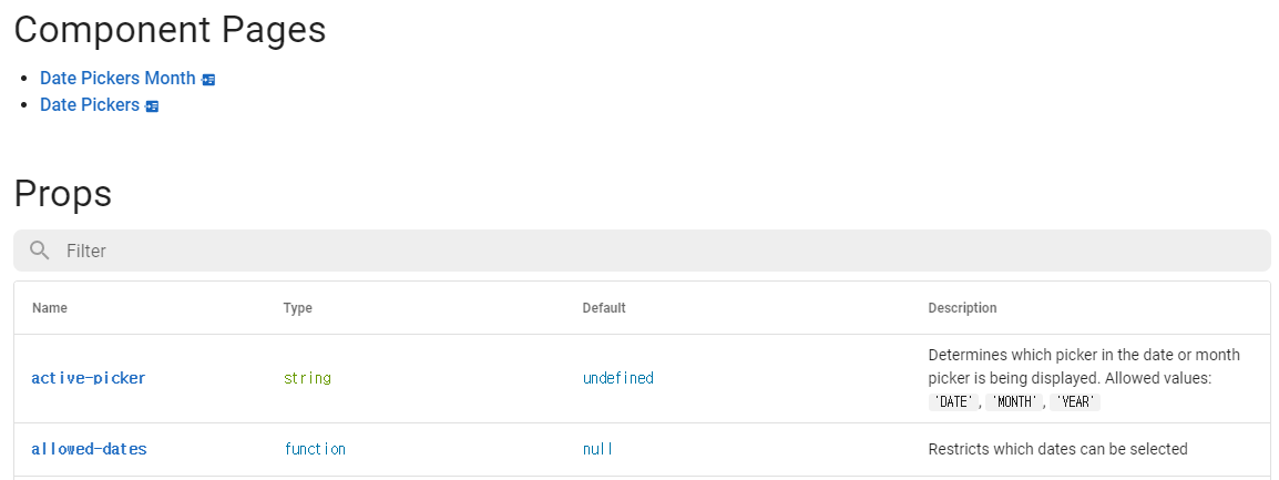Date Pickers의 API문서를 보면 allowed-dates 라는 필터가 있다. 이 필터를 사용하여 과거 날짜를 선택하지 못하도록 처리할 수 있다.