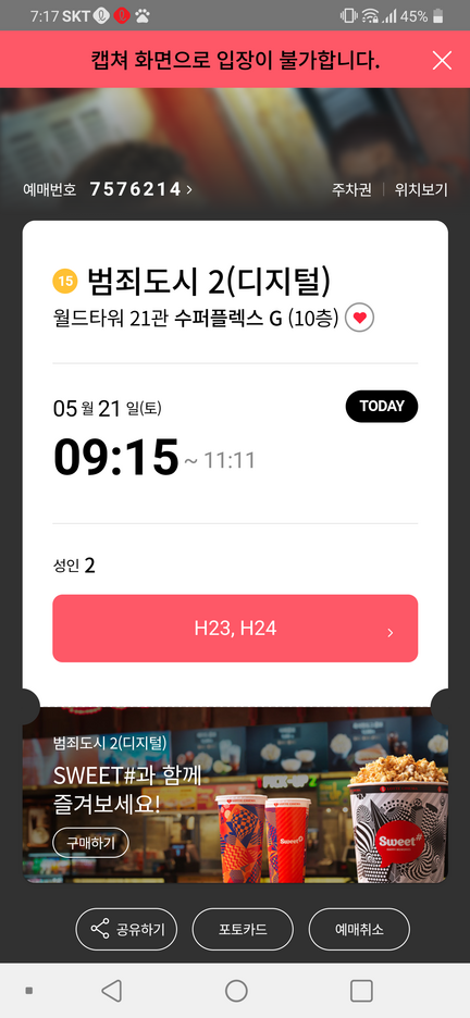 롯데시내마 롯데월드타워점을 선택하고 21관을 선택하였다. 좌석이 애매했는데 릴로드하다보니 예약취소 좌석이 나왔고 바로 예약했다.