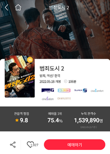 아침7시 범죄도시2를 보러갈까 말까 고민중이었는데 와이프에게 손석구도 나온다고 얘기했더니 그럼 보자고 한다. 급히 롯데시네마 앱을 실행하고 예약에 나섰다.